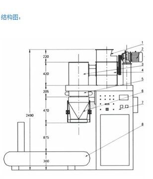 1.進(jìn)料口 2.絞龍電機(jī) 3.控制器  4.給料器  5.除塵罩  6.夾袋式電子秤  7.電控柜  8.輸送縫包系統(tǒng)